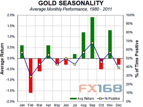 从以上五幅图表可以看出,黄金在6月份的表现不容乐观,其中在2002年至2012年期间,黄金在一年中有11个月均录得上涨,唯独6月例外。