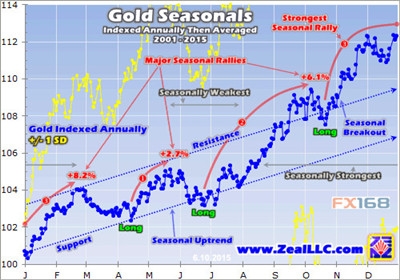 国外财经网站Market Orcle周二(5月30日)撰文就贵金属的季节性表现进行了分析。具体来说,其针对黄金或白银在过去12个月的平均月度表现情况。为了追求客观性,该网站选用了几大权威来源的季节性图表。具体如下: