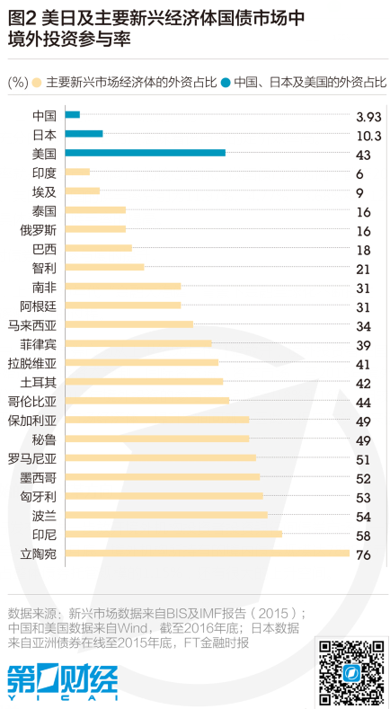在亚洲新兴市场中,泰国债券市场从上世纪90年代开始放开,境外投资者在国债市场的占比从初期的2%上升到2015年的16%。马来西亚2003年开始逐步解除资本管制,国际资本流入资本市场,至2015年境外投资者在国债市场的参与度达34%。巴西、俄罗斯等国也经历了类似过程,2015年境外投资的参与率分别达到18%和16%。相较之下,截至2016年底,中国国债市场的境外参与率为3.93%,远低于其他新兴市场经济体,提升空间可观。因此,保守估计未来该比例将上升达到6%与印度持平(图2)。