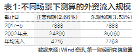 关于“债券通”的开放对当前债券市场海外投资规模有何影响,我们从两个角度探讨。首先从过去吸引外资流入的增速来看,2016年2月开放银行间市场前,外资规模增速环比0.91%,而银行间市场开放后该速率增至2.22%。如果“债券通”开放吸引外资的水平与开放银行间市场相当,那么未来可以期望境外投资规模增速上涨至3.53%。但实际上这种估计过分乐观,考虑到债券通目前仅开放现券交易,衍生品并未开放,所以对外资的吸引远低于2016年开放银行间市场带来的影响。假定影响仅为2016年增量的1/3,增速则为2.66%。那么在这两种情况下,未来几年外资规模如表1所示。