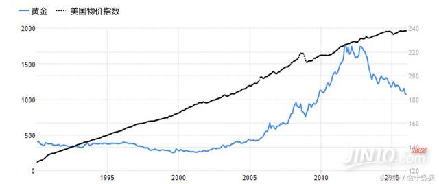 上图其实颇为值得玩味。1990年至今,CPI指数在120-240之间上升,几乎翻了一番,但黄金同期从低于400美元/盎司的水平上涨至1250美元/盎司左右,这几乎翻了三倍。如果到会几年前,黄金价格甚至上涨至1750美元/盎司的纪录新高。