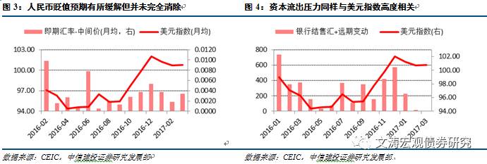 而另一方面,近来中美经济实际上维持着短周期共振向上的格局。但在今年二季度,中国经济可能先于美国见顶回落。而目前央行对跨境资金宽进严出的管理措施,更多的是增加资本外流的摩擦成本,还难以完全逆转汇率重估预期下,境内居民多元化资产配置的动力。因此,如果2017年下半年国内经济下行的风险增大,叠加美元指数重回上行,外部平衡的压力可能在下半年重现。